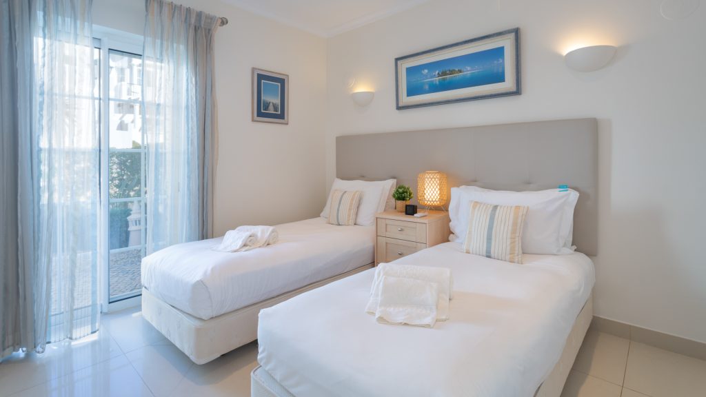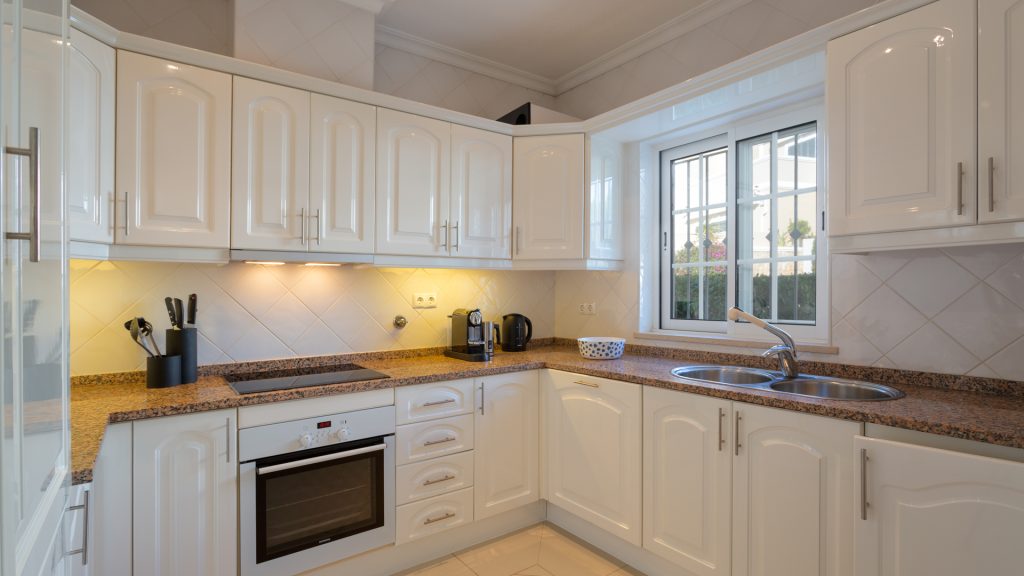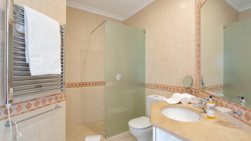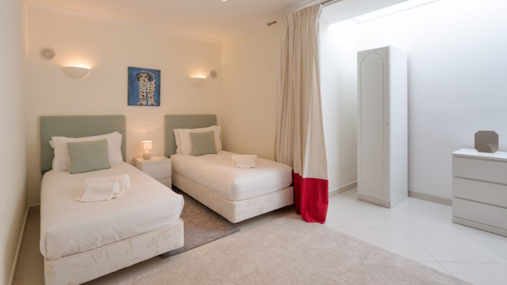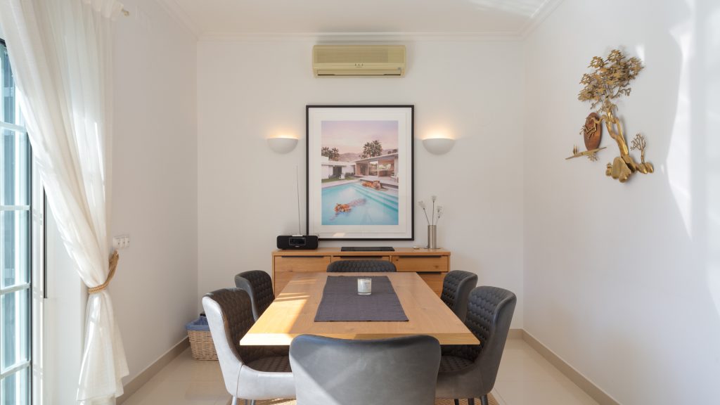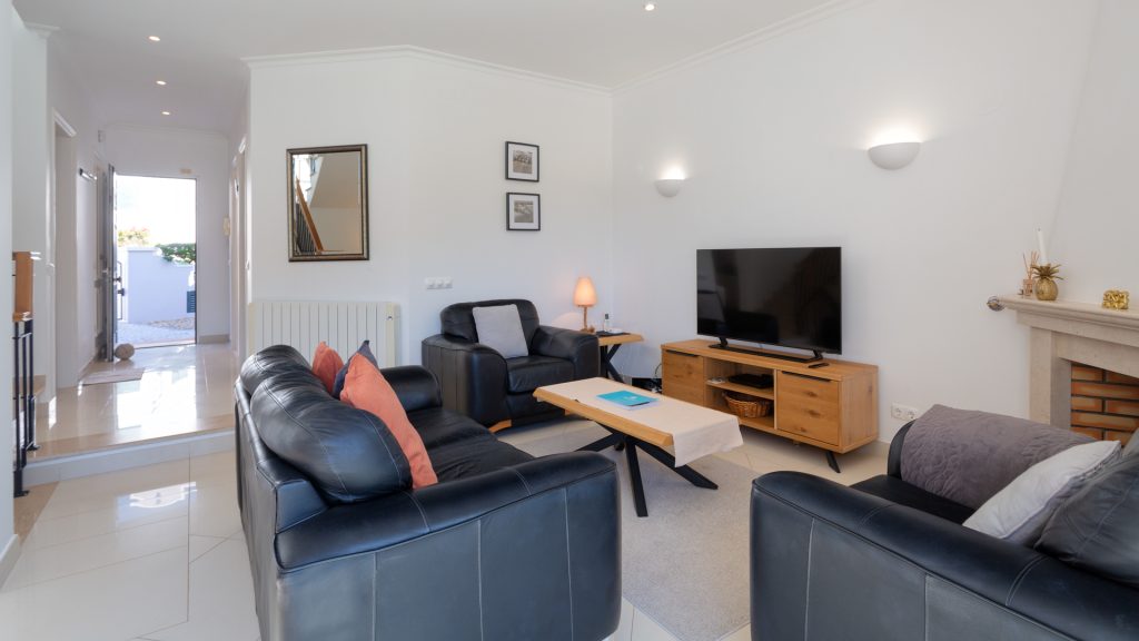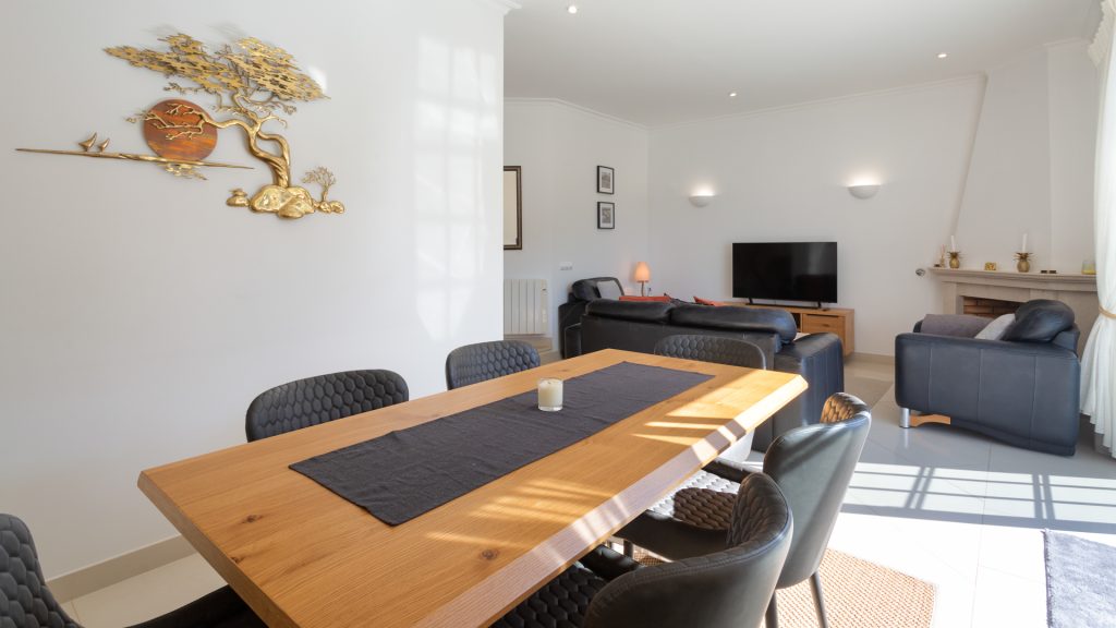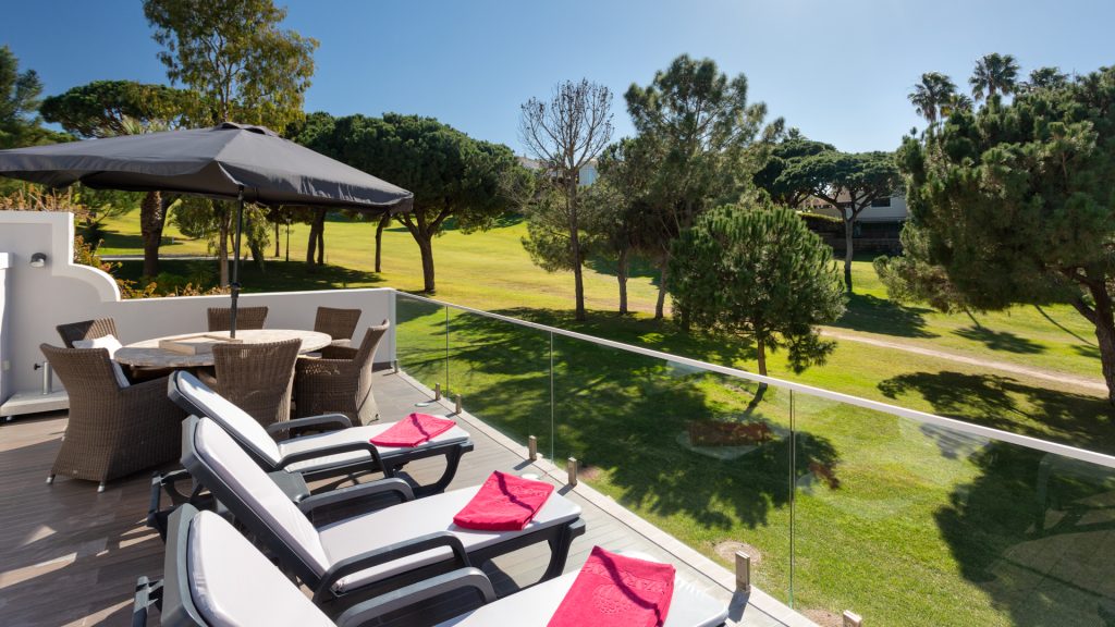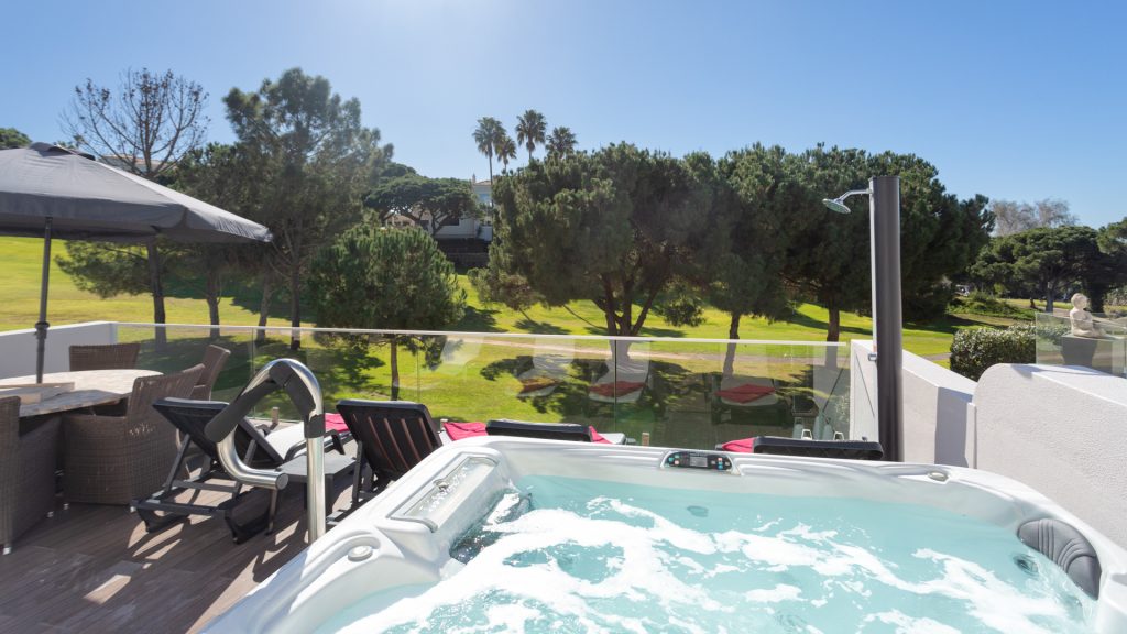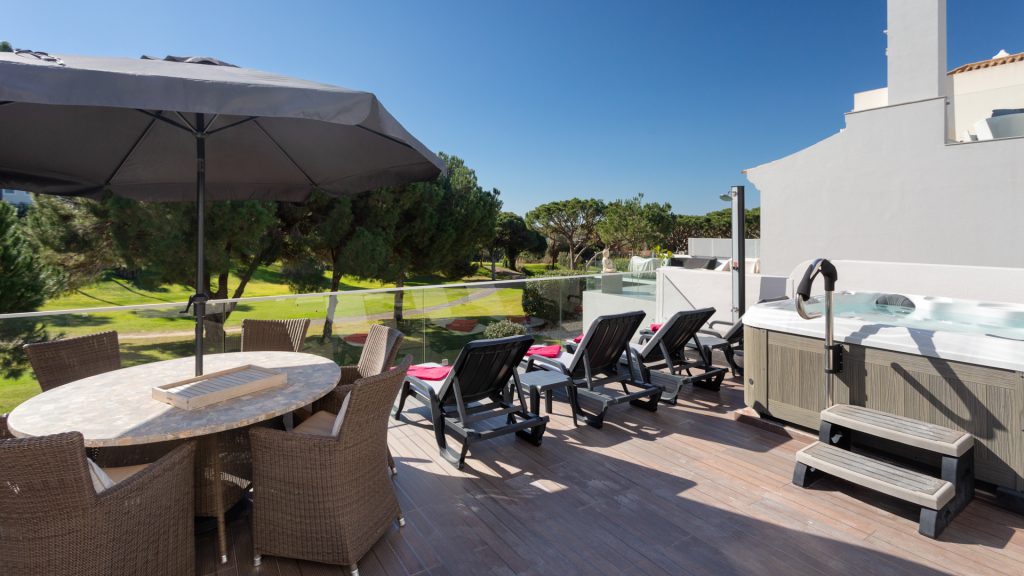 An excellent three bedroom townhouse with jacuzzi, overlooking the 8th fairway of the Vale do Lobo Ocean Golf Course. The hallway leads into the main living area – a lovely sitting room with bright dining area. There is also a fully fitted & equipped kitchen on the ground floor. The upper level of the villa comprises the master double bedroom, with an en-suite bathroom with a separate shower room and patio doors that lead to a private, south facing sun terrace. The third bedroom is on the lower level and is also a self-contained children’s playroom served by an adjacent shower room. The patio doors open onto the terrace which has a built-in gas BBQ, a private jacuzzi and plenty of room for sunbathing & dining whilst taking in the golf views.