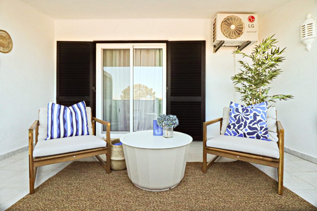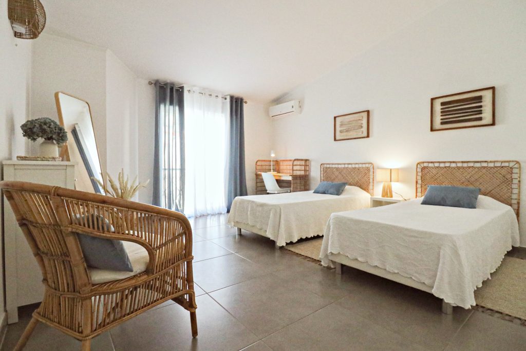Situated on the first floor, the property comprises a master bedroom with a double bed, a modern bathroom, a fully equipped kitchen, and a bright living area with direct access to a pleasant balcony. Additionally, there is a second bedroom with twin beds and a private bathroom, offering enhanced comfort and privacy.