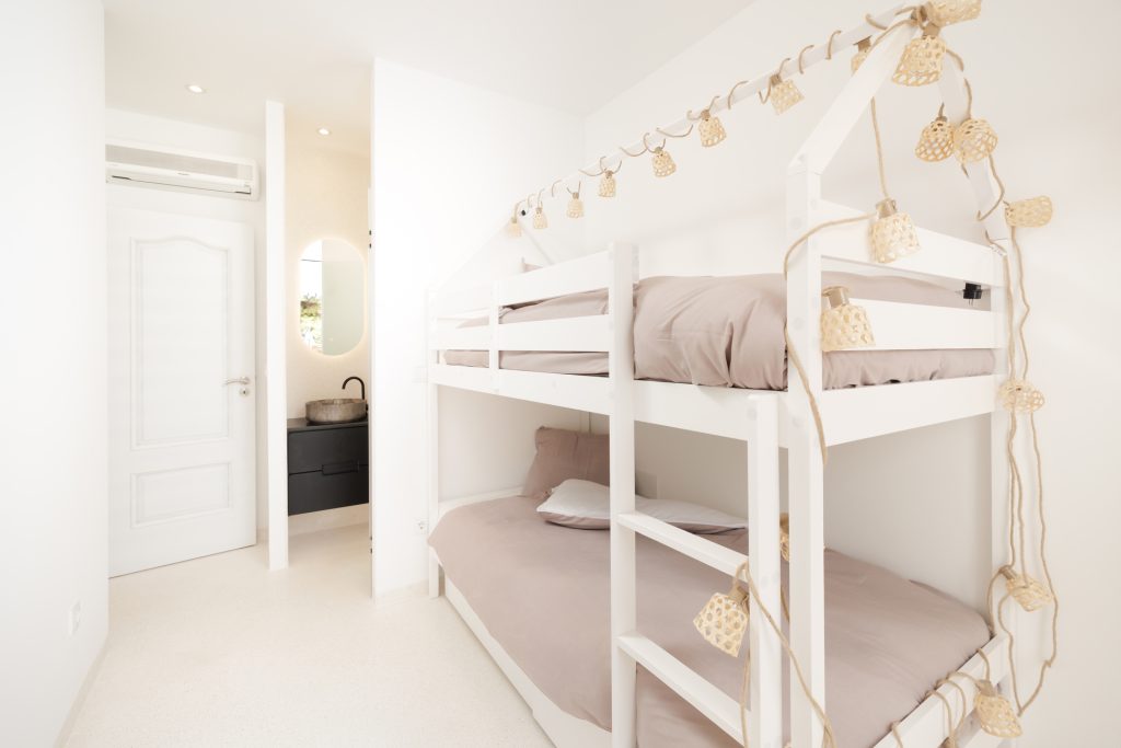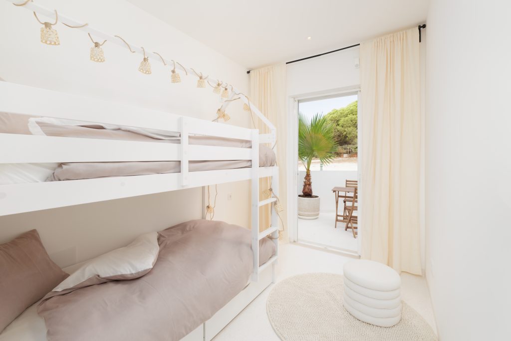 No rés-do-chão encontra-se uma cozinha totalmente equipada, uma sala de estar em open space com área de jantar que dá acesso ao jardim e ao terraço. O primeiro andar é composto pela suíte principal com casa de banho e varanda privada, com vista para o campo de golfe. [50366/AL; 9838/AL]. Perfeito para famílias pequenas, devido ao segundo quarto com beliche para crianças.