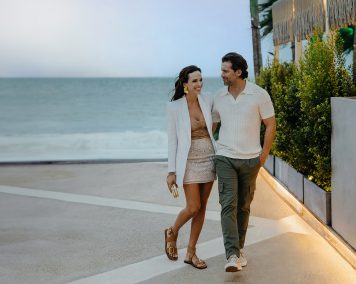 A couple standing on the beach, embracing while looking out over the ocean at Vale do Lobo Resort.